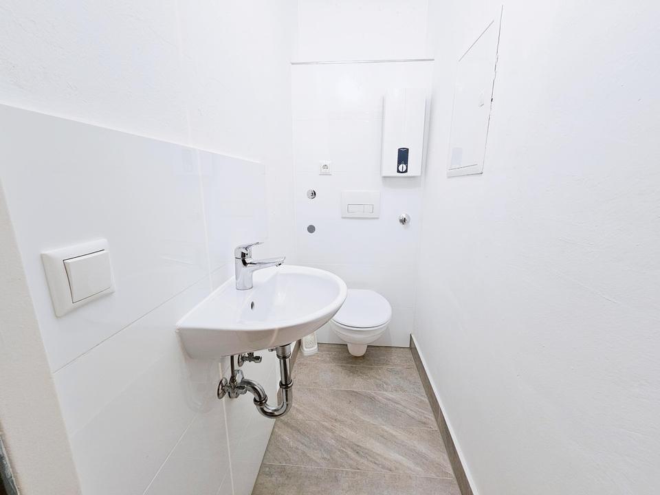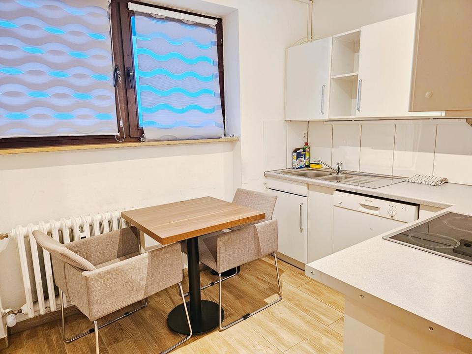 Die moderne Einbauküche ist voll ausgestattet inkl. Spülmaschine, Kaffeemaschine, Wasserkocher und sämtlichen Küchenutensilien. Frisch saniertes Bad mit Dusche sowie separates Gäste-WC.