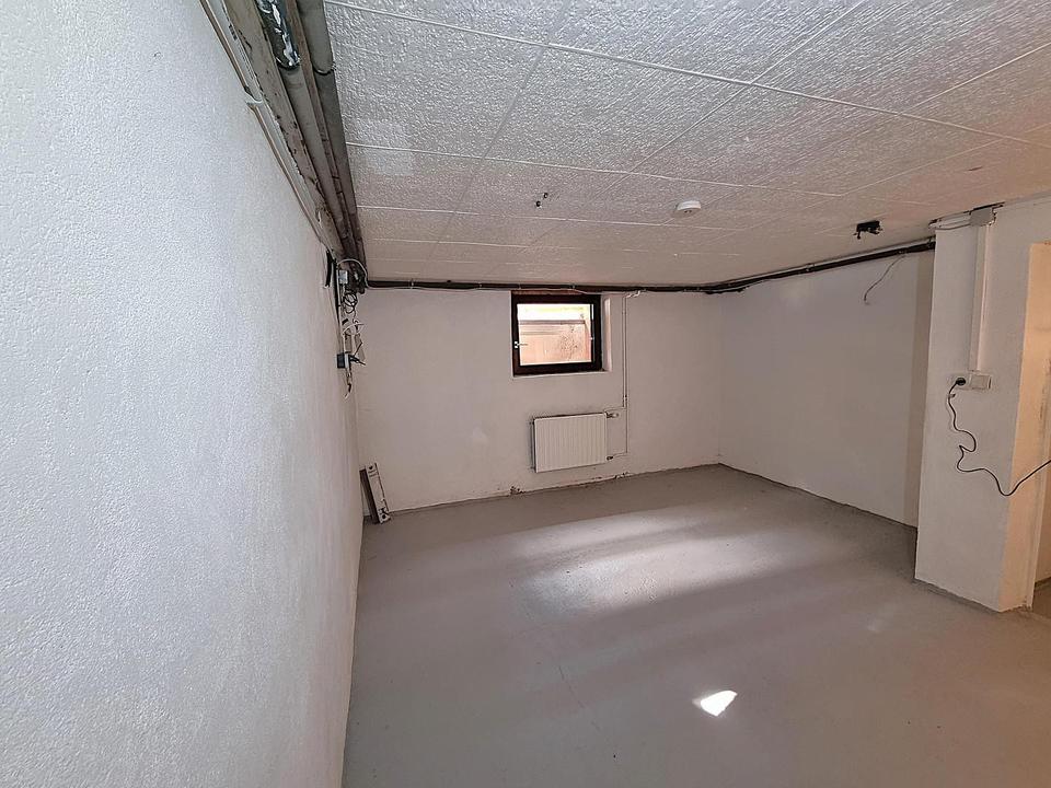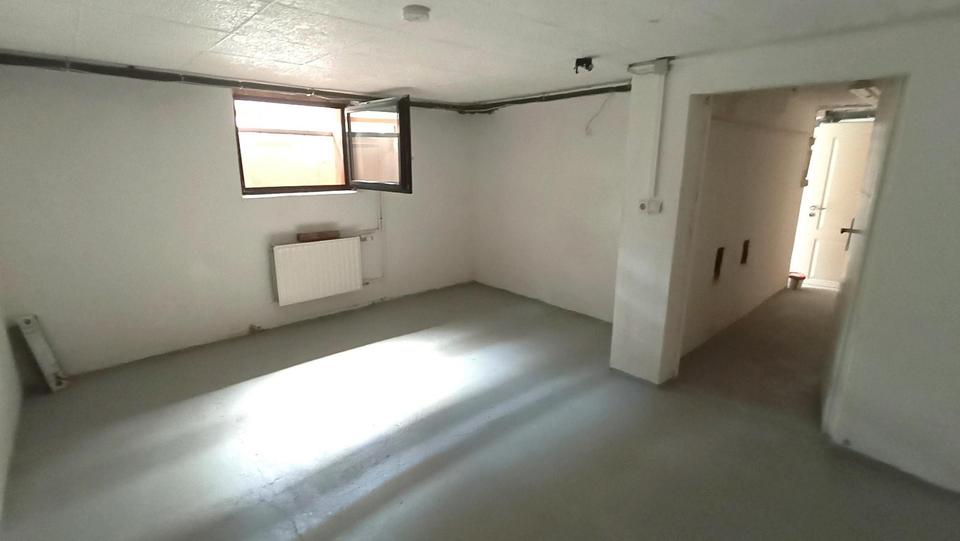 Kellergeschoss: Am Ende der Kellertreppe hält eine Tür die Kälte vom Erdgeschoss fern. Ein kleiner Flur verbindet zwei abschließbare Räume. Der erste, mit großem Fenster, beherbergt Haustechnik mit Gastherme und Zähleranschlüssen. Der zweite, ebenfalls hell mit Fenster und Heizkörper, eignet sich flexibel als Büro, Gäste- oder Hobbyraum.