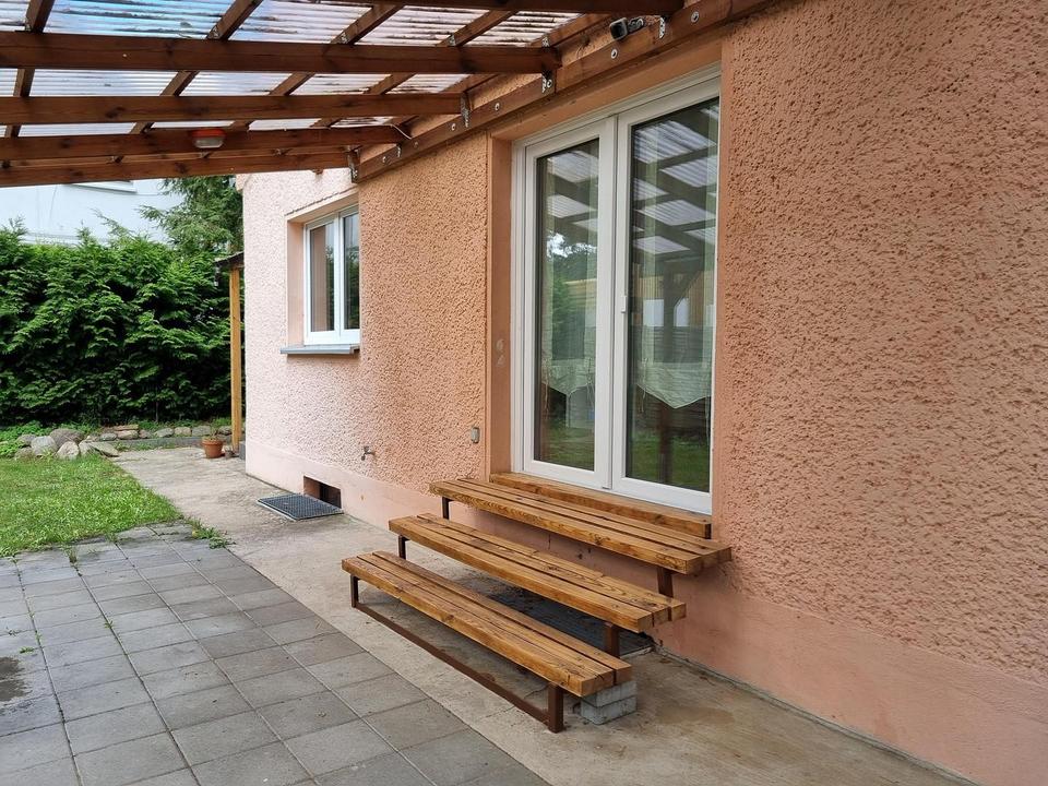 Erdgeschoss: Beim Betreten des Hauses gelangt man in einen hellen Windfang mit zwei Fenstern, Heizkörper und neu gefliestem Boden in dunkler Sandfarbe. Eine Massivholz-Haustür führt in den Flur. Links liegt ein helles Badezimmer mit neuem Sandfliesenboden und Fußbodenheizung; daneben führt eine Treppe ins Obergeschoss. Rechts befindet sich die offene Küche zum Flur abgetrennt durch eine Glastür, mit Westfenster. Am Ende des Flurs führt eine Glasschiebetür ins Wohnzimmer mit Terrassentür zur überdachten Terrasse mit Beleuchtung. Ebenfalls dort liegt das Schlafzimmer mit viel Nachmittagslicht. Neben der Schlafzimmertür befindet sich der Zugang zur Kellertreppe.