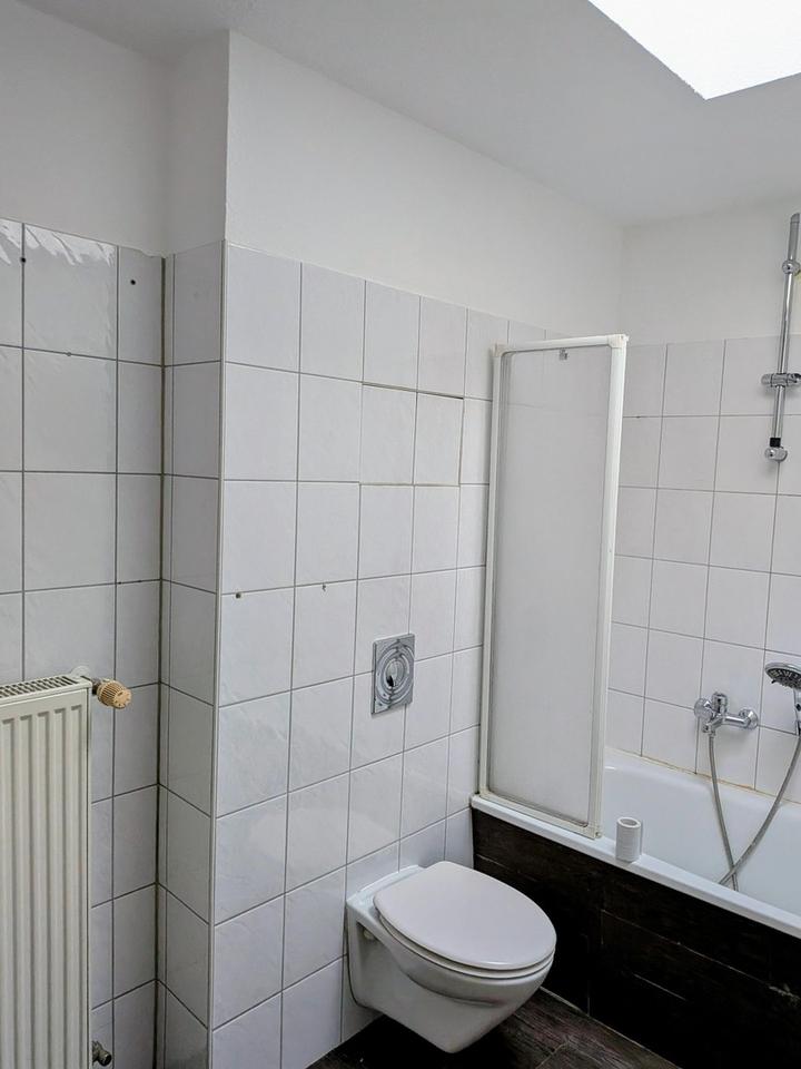 Zusätzlich gibt es ein Badezimmer mit Badewanne, das durch Lichtkuppelfenster im Dach Tageslicht erhält. Der Flur profitiert ebenfalls von einer Lichtkuppel für Tageslicht. In der Wohnung befindet sich ein kleiner Abstellraum, und im Keller gibt es einen weiteren Abstellraum.