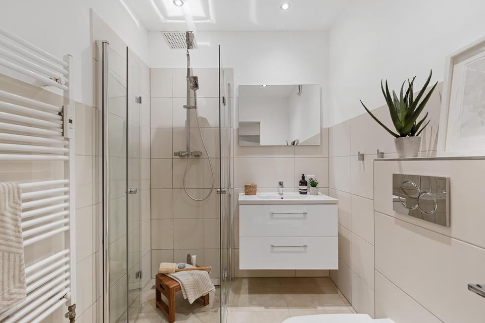 Das moderne Duschbad ist mit hochwertigen Materialien, eleganten Großformatfliesen sowie zeitgemäßer Ausstattung versehen.