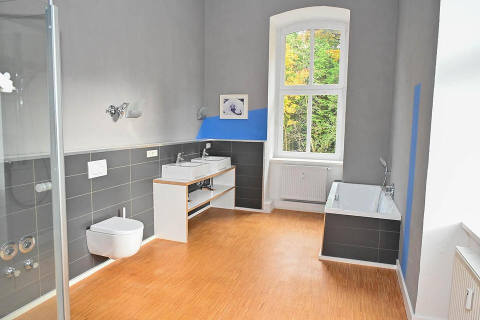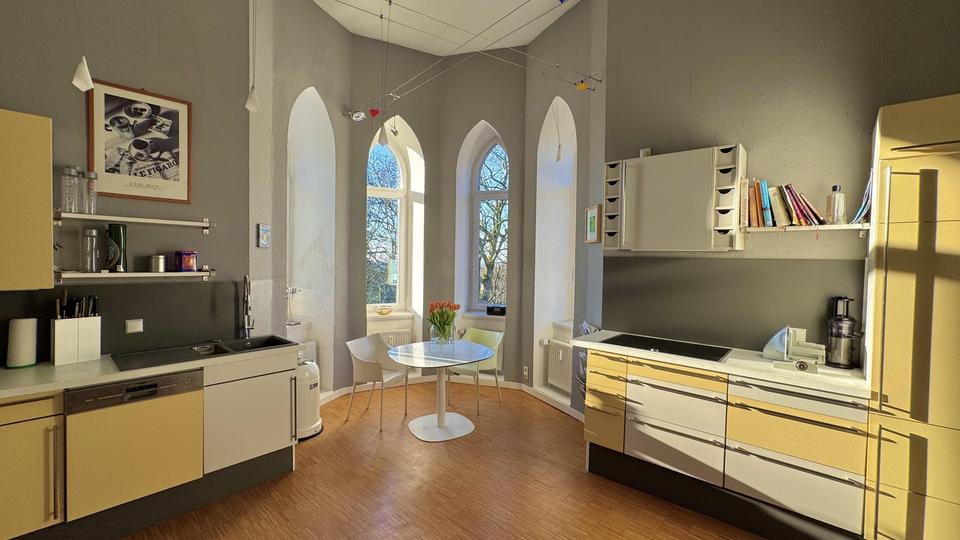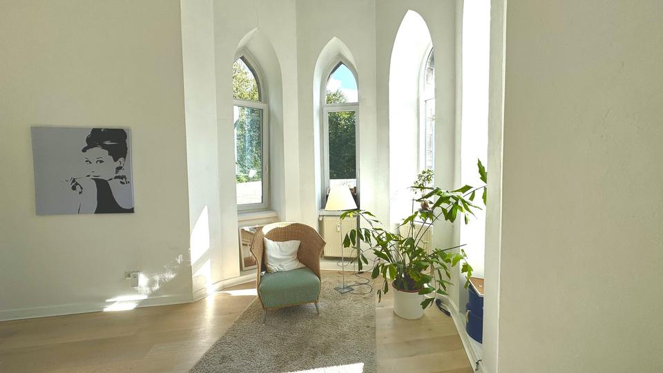 Das Haus entstand in der Gründerzeit; die Wohnung ist 190 m² groß und liegt im ersten Obergeschoss.