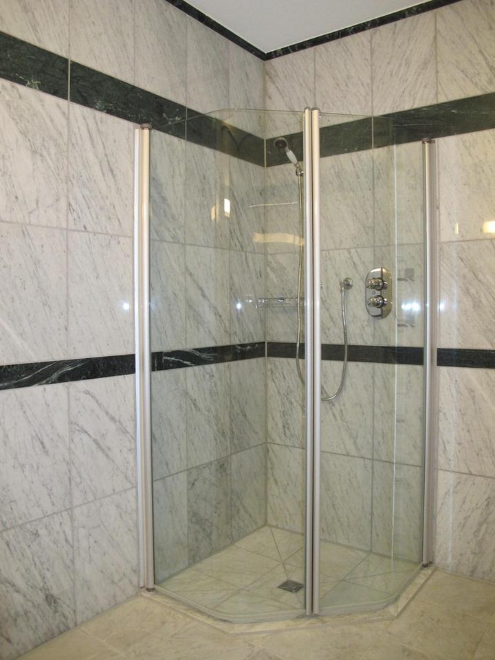 • Klassisch elegantes Marmor-Tageslichtbad mit bodengleicher Dusche