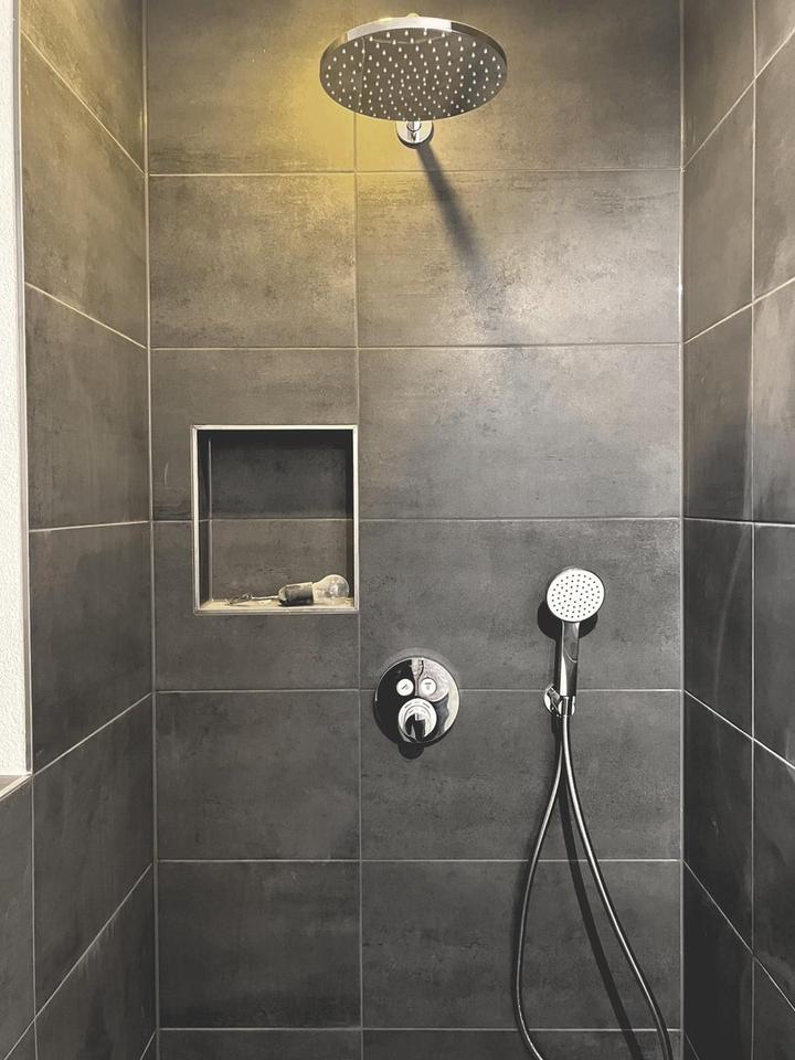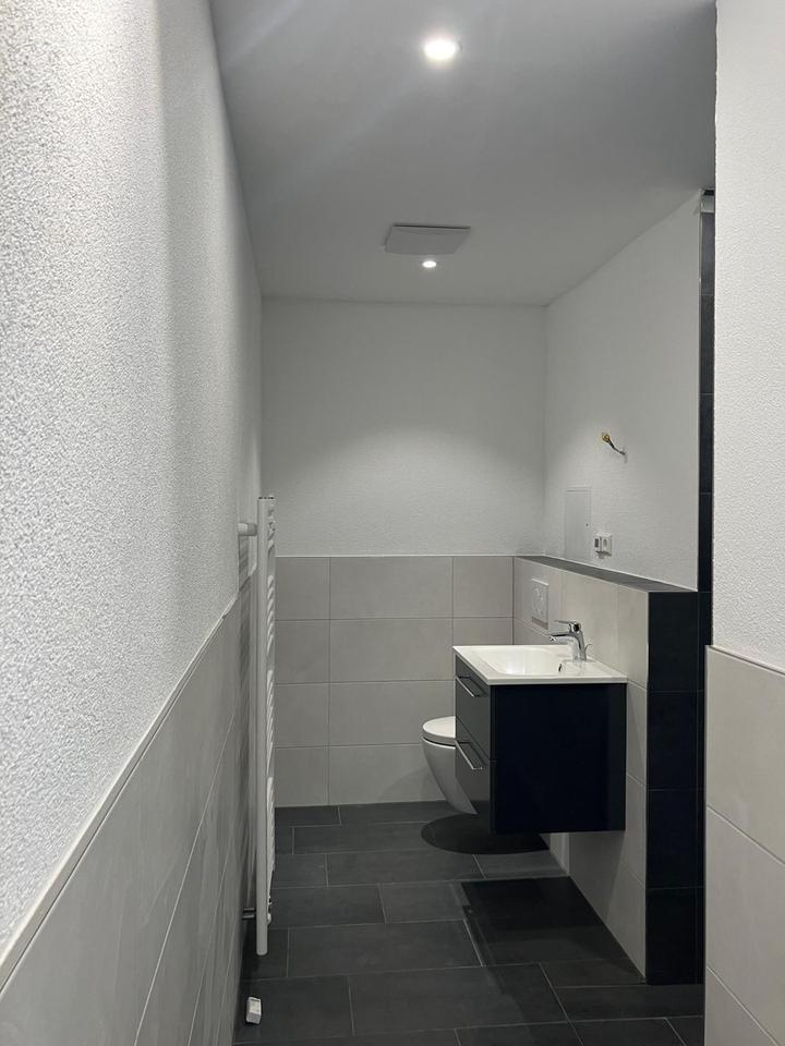 + modernes Bad mit Fußbodenheizung und bodengleicher Dusche (gefliest)