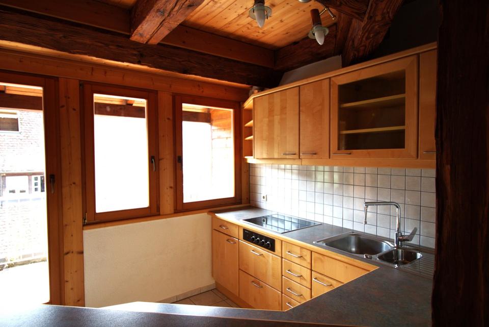 Im Herzen der Wohnung eröffnet sich ein großzügiger Wohn- und Essbereich mit offener Küche, der wie geschaffen ist für gemeinsame Stunden und stille Momente gleichermaßen. Die alten Sichtbalken erzählen von vergangenen Zeiten und verleihen dem Raum eine Seele, die Wärme und Geborgenheit schenkt. Sonnenlicht tanzt durch die vielen Fenster und erfüllt jeden Winkel mit einer heiteren, freundlichen Atmosphäre – ein Ort, an dem man sich sofort zuhause fühlt. Und wenn sich die Tür zur charmanten Loggia öffnet, wartet ein kleiner Rückzugsort im Freien: hier lassen sich Gedanken treiben, Momente genießen und Träume wahr werden.