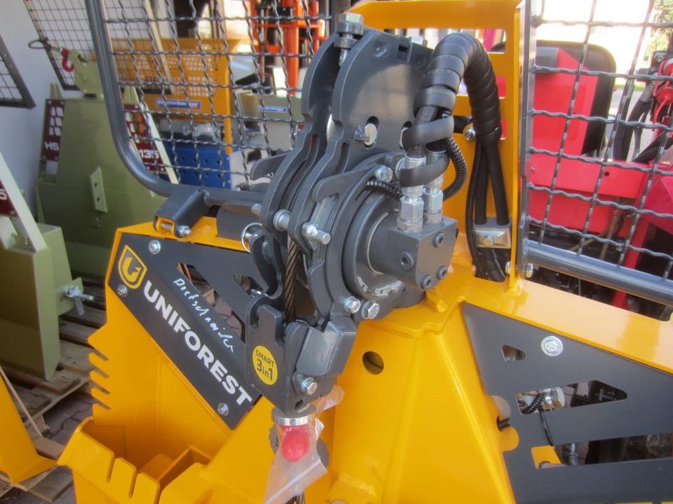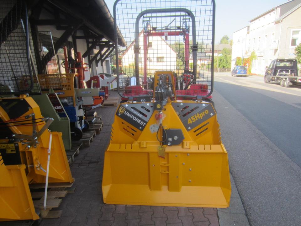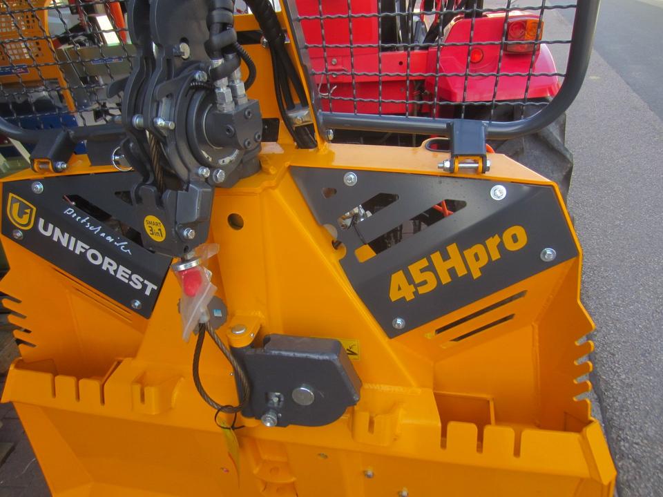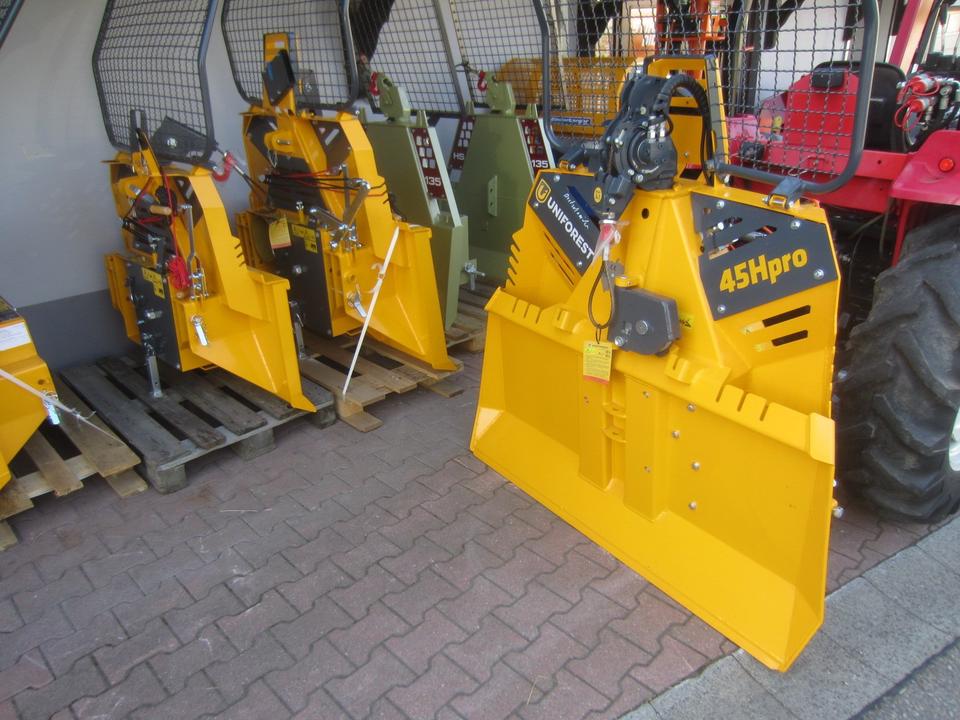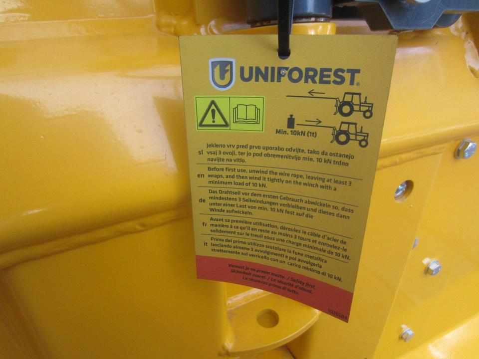 Forst Seilwinde UNIFOREST 45 HYDRO pro Seilausstoß mit Einlaufbremse und Endabschalter Funkfernbedienung original TERRA Zugkraft 4,5 Tonnen Dreipunktaufnahme KAT. I und II Maschinengewicht 421 kg Schildbreite 150 cm Anhängevorrichtung Untere Umlen…