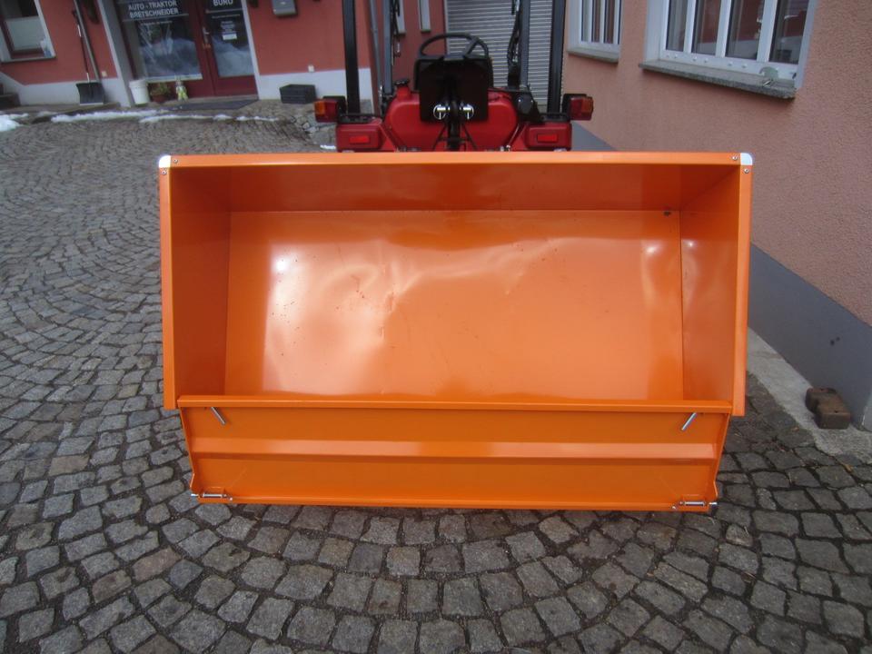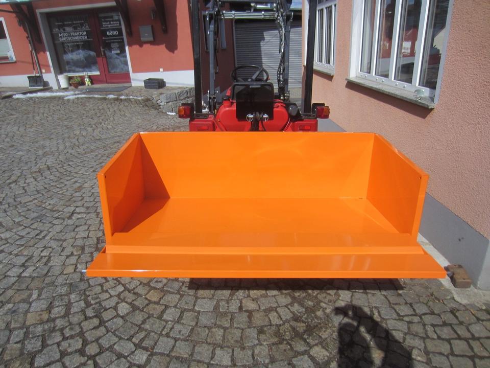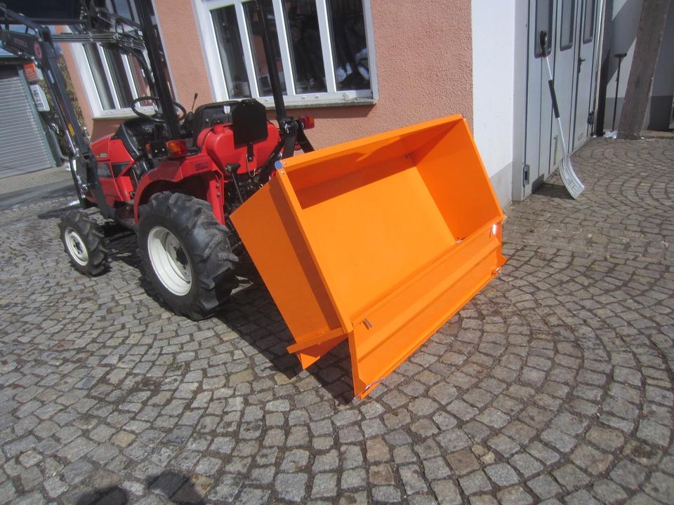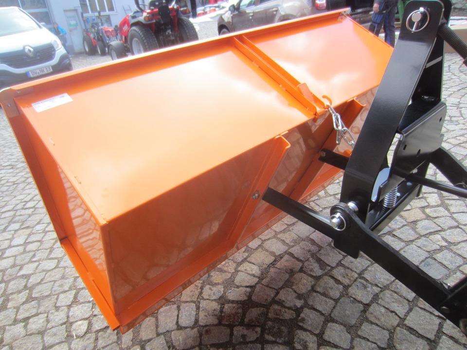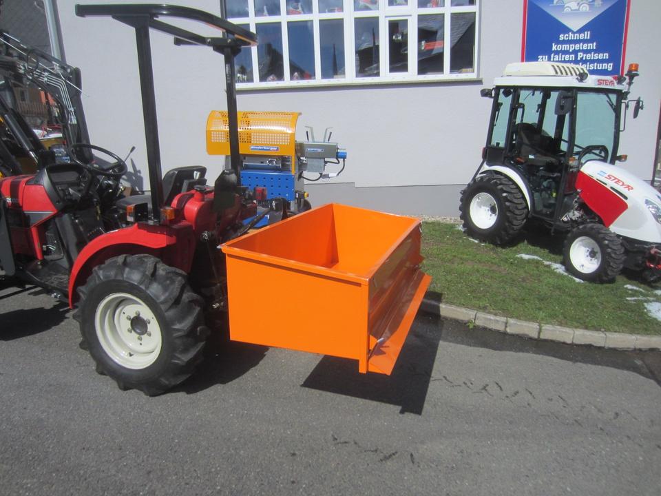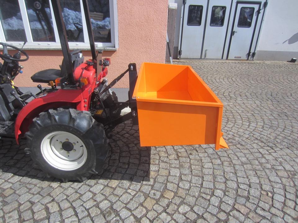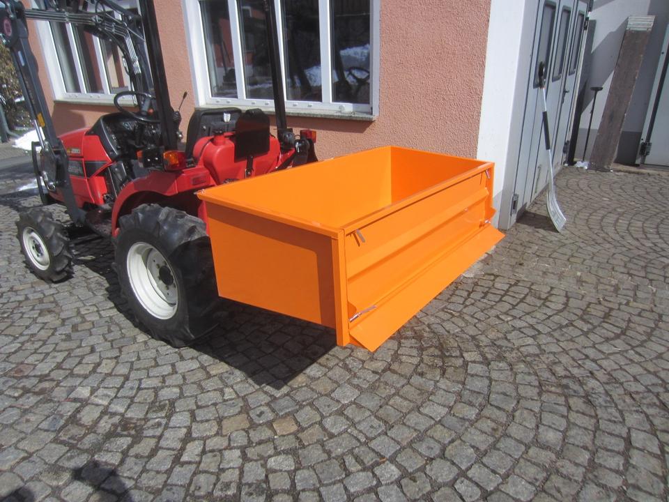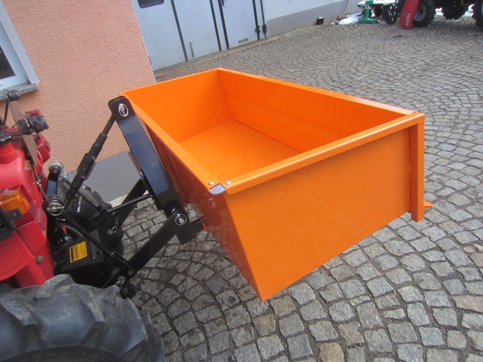 Die Transportbox ist die ideale Lösung für die Verladung und Beförderung von Schüttgut, Brennholz und sonstigen Materialien. Die Box wird mithilfe der hinteren Dreipunktaufnahme Kat. 0/1 oder mittels Frontkuppeldreieck (optional) des Traktors gehoben. Die Kippfunktion wird manuell mit einem Arretierungshebel ausgelöst, dabei sichert eine stabile Kette den Kippwinkel. Die vordere Wand der Box ist schwenkbar oder ganz abnehmbar. Die Auffahrkante der Box vereinfacht das Laden der Schüttgüter beim Rückwärtsfahren der abgesenkten Box in einen Materialhaufen (Rindenmulch, Futtermittel, Schnee u. a.) Das Innenmaß der Box ist 150x61x45cm.
